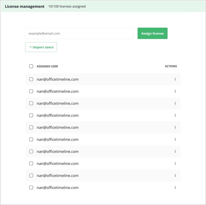 Bulk Import lets you upload a CSV file containing the email addresses of the users you want to assign licenses to. The system automatically validates the list, removes duplicates, and assigns licenses up to the number available in your subscription.