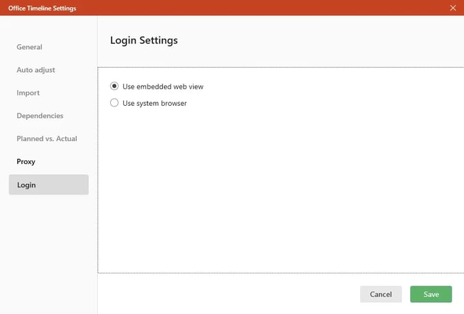 Embedded vs System Browser Log-In Methods in Office Timeline