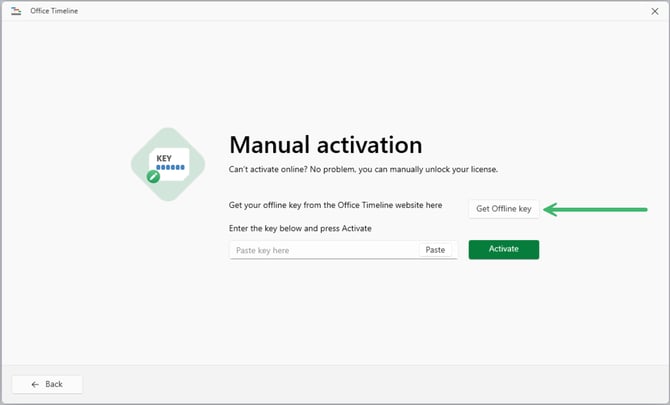 Now, copy/paste the Offline key for this machine into the text box here, and it will activate Office Timeline without any network connectivity: