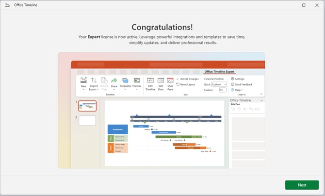 After logging in, Office Timeline will automatically verify your subscription and unlock your Lite, Plus, or Expert features.