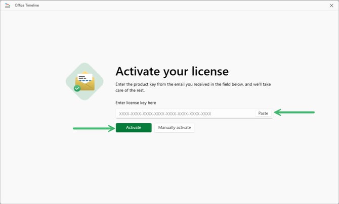 Paste or type your new product key and click the Activate button to activate Office Timeline.