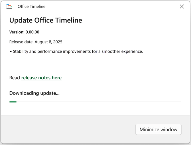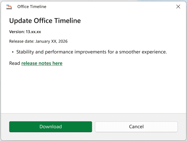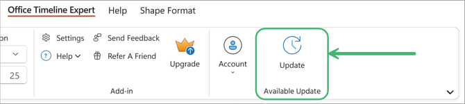 When updates are available, an Update button will appear in the Office Timeline tab of your PowerPoint ribbon. Office Timeline offers an in-app way to check for and install updates. You can still download and install updates directly from our website if needed.