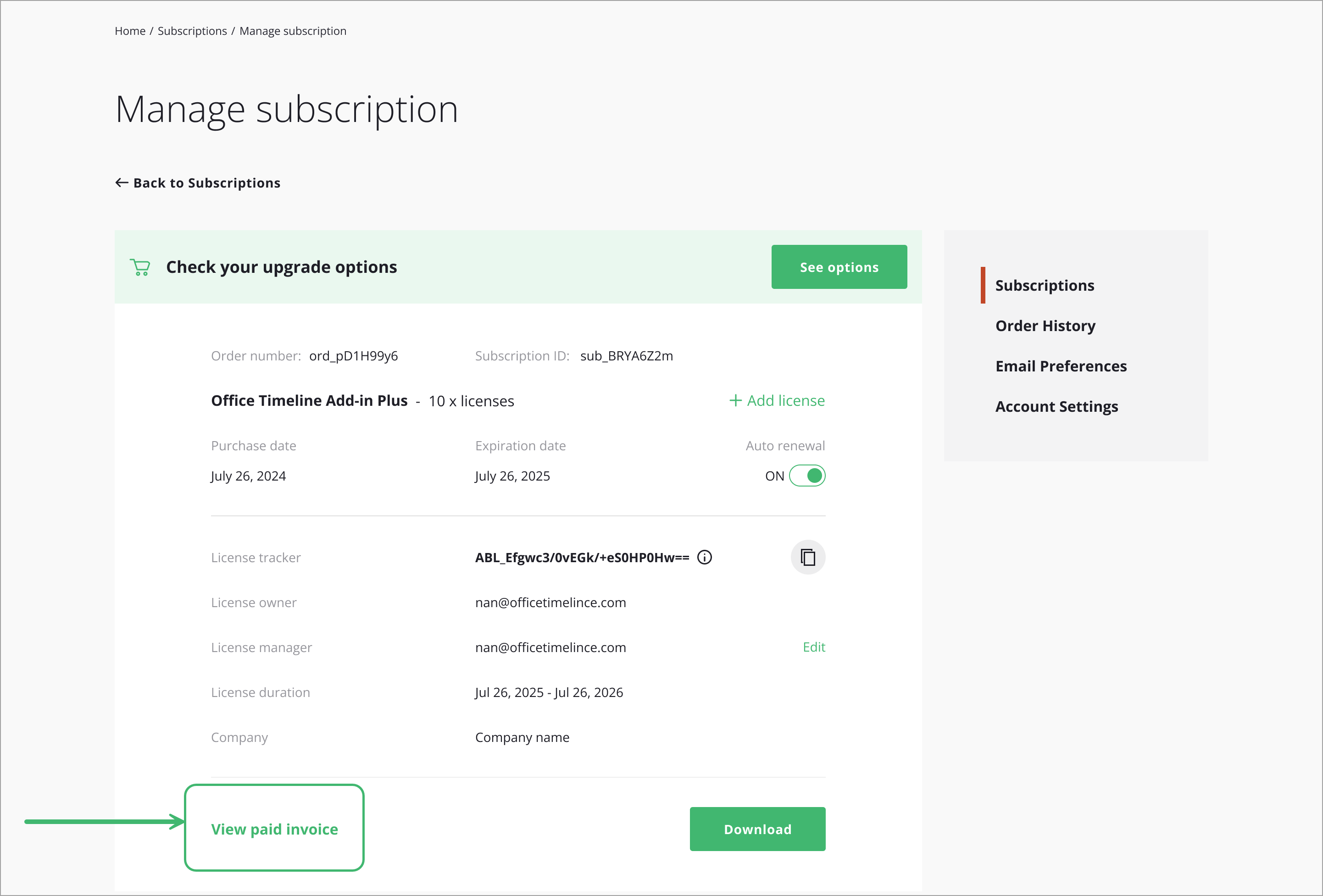 Identify the subscription for which you need the invoice and click on View paid invoices. From the invoice page, you can print the invoice or send a copy to any email address. As for the product key, you will find it visible both on the subscription card and on the invoice page.